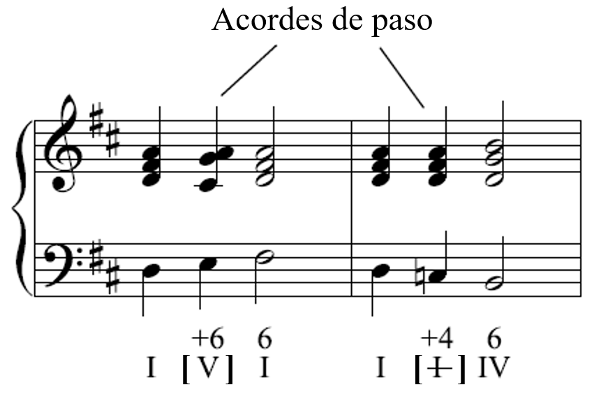 ACORDE DE PASO: ACORDE DE ADORNO que une dos ACORDES diferentes o dos ESTADOS diferentes de un mismo acorde y se sitúa en tiempo débil en relación con algunos de los otros dos. La forma principal de acorde de paso es la DOMINANTE DE PASO, principal o SECUNDARIA. La definición de acorde de paso es independiente de que sus notas sean o no NOTAS DE PASO