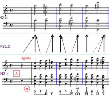 ACORDE ESTRUCTURAL: ACORDE que adquiere una relevancia especial dentro del NIVEL DE SÍNTESIS en que se analice como consecuencia de su situación métrica y formal. Estos acordes deben ser capaces de aglutinar y explicar aquellos otros del nivel anterior, llamados ACORDES SUBORDINADOS, a los que sintetizan.  Constituyen el soporte de las NOTAS ESTRUCTURALES que correspondan a ese nivel analítico. Los acordes estructurales se señalan con una flecha vertical y el resto con otro tipo de flechas como muestra el ejemplo.