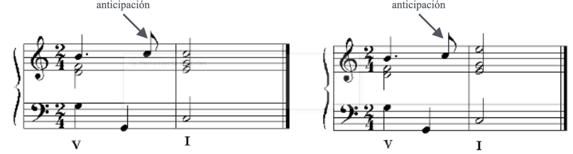 ANTICIPACIÓN: NOTA DE ADORNO que es NOTA REAL en el ACORDE inmediatamente posterior. La anticipación puede no aparecer en el acorde posterior. La anticipación se sitúa en parte débil con respecto al acorde al que antecede.