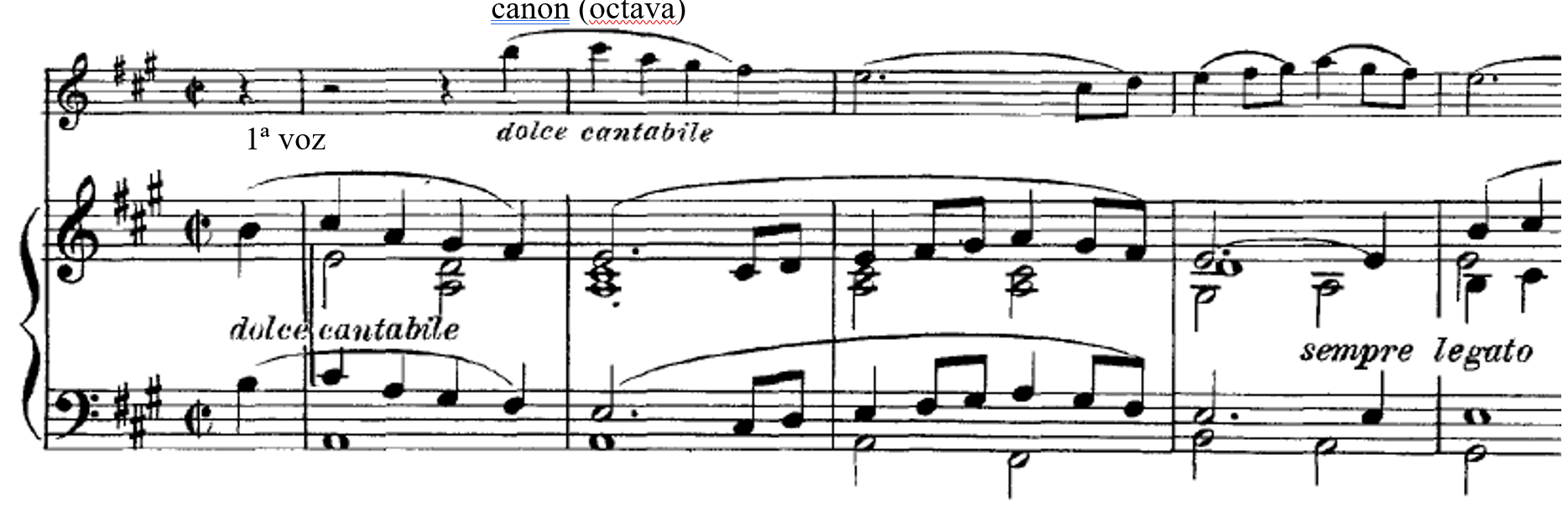 El TEMA de este movimiento se presenta en un canon a la octava y un compás de distancia entre la mano derecha del piano y el violín.