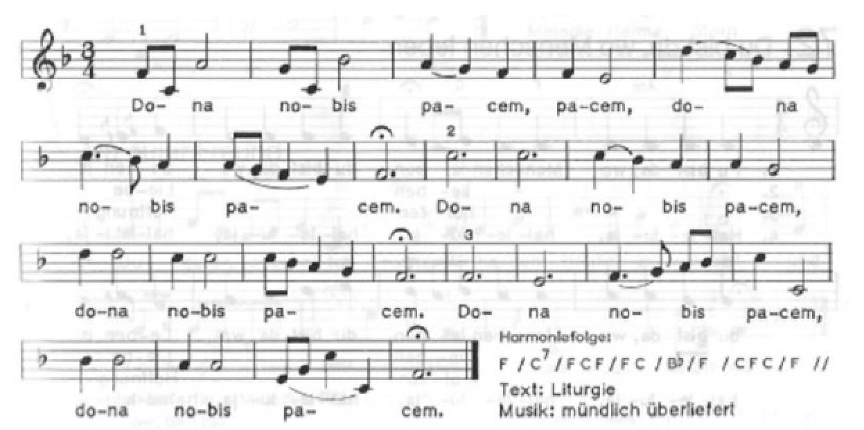 Canon de la tradición litúrgica alemana en escritura simple. La MELODÍA de 24 compases se canta a 3 VOCES, comenzando cada uno en los números que se indican. La ESTRUCTURA ARMÓNICA (“Harmoniefolge”) resultante de la superposición está cifrada en CIFRADO AMERICANO.