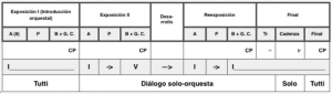 • Sonata Tipo 5: Forma Sonata de Concierto clásico, típicamente con una primera Exposición orquestal sin modulación, una segunda Exposición con solista y modulante, y un añadido final que conduce a una CADENZA del solista antes de un breve final