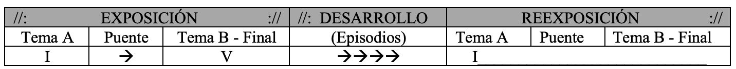 En la forma Sonata este esquema se amplia presentando dos TEMAS contrastantes en cada uno de los dos CENTROS TONALES de la EXPOSICIÓN, conectados por un pasaje de TRANSICIÓN o PUENTE. Tras un DESARROLLO de dimensiones y contenido variable, en la REEXPOSICIÓN se vuelve a presentar el material de la Exposición, pero esta vez sin cambio de centro tonal.