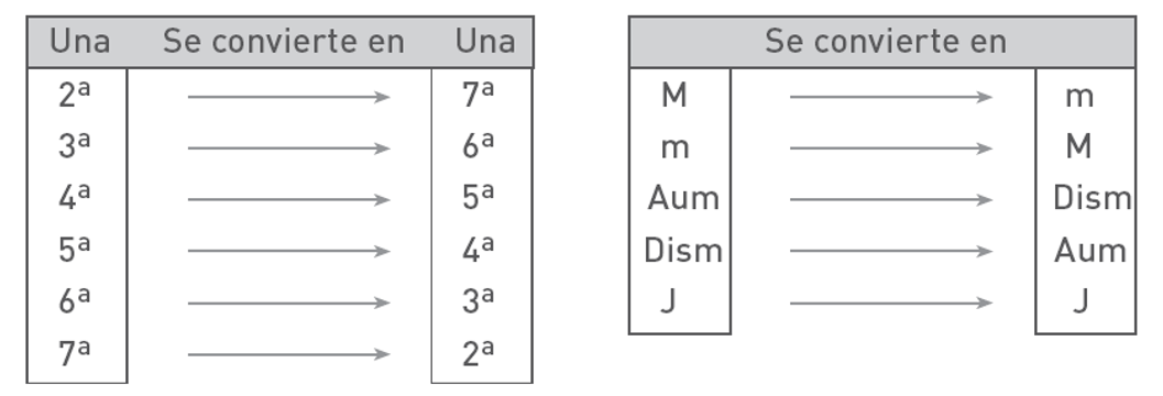 El tipo del intervalo cambia (menor se convierte en mayor, mayor en menor, aumentado en disminuido y viceversa). Los intervalos justos se mantienen justos en su inversión.