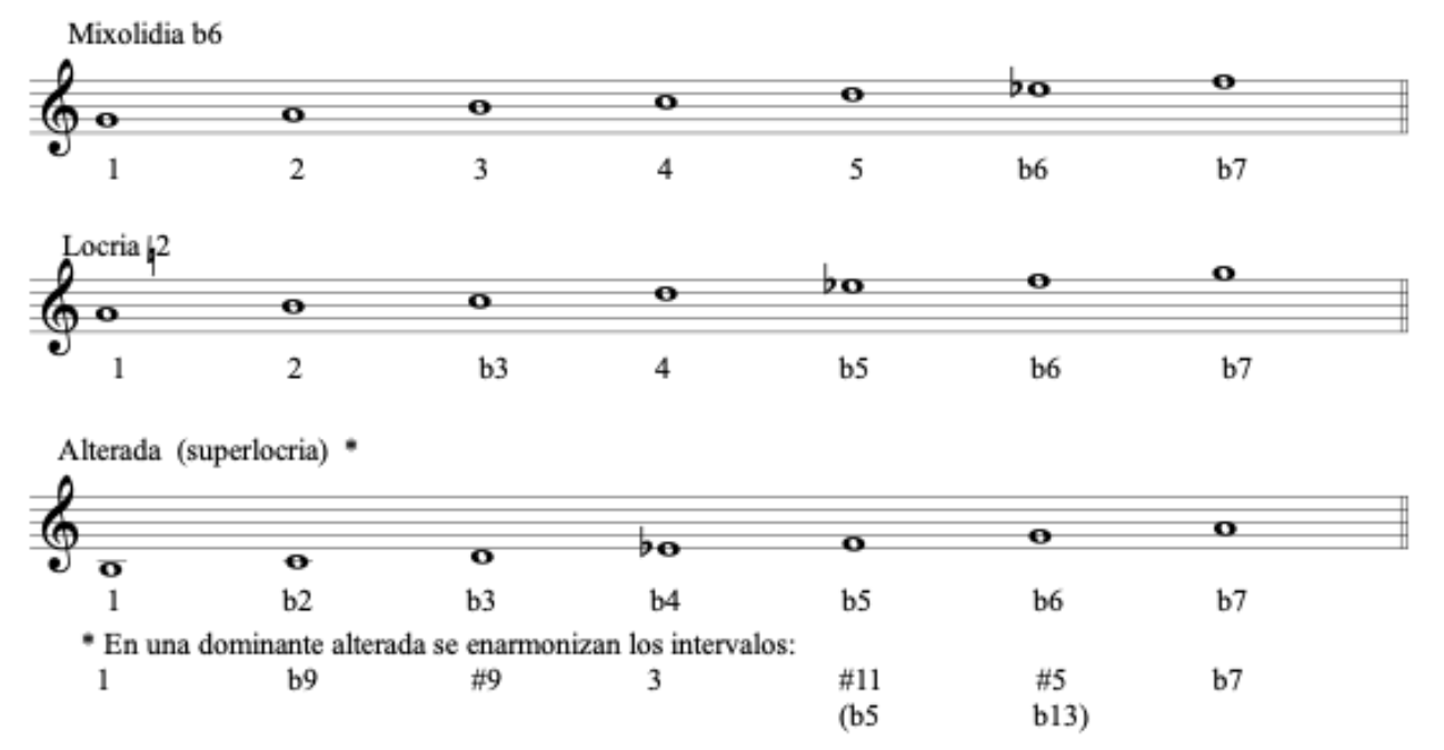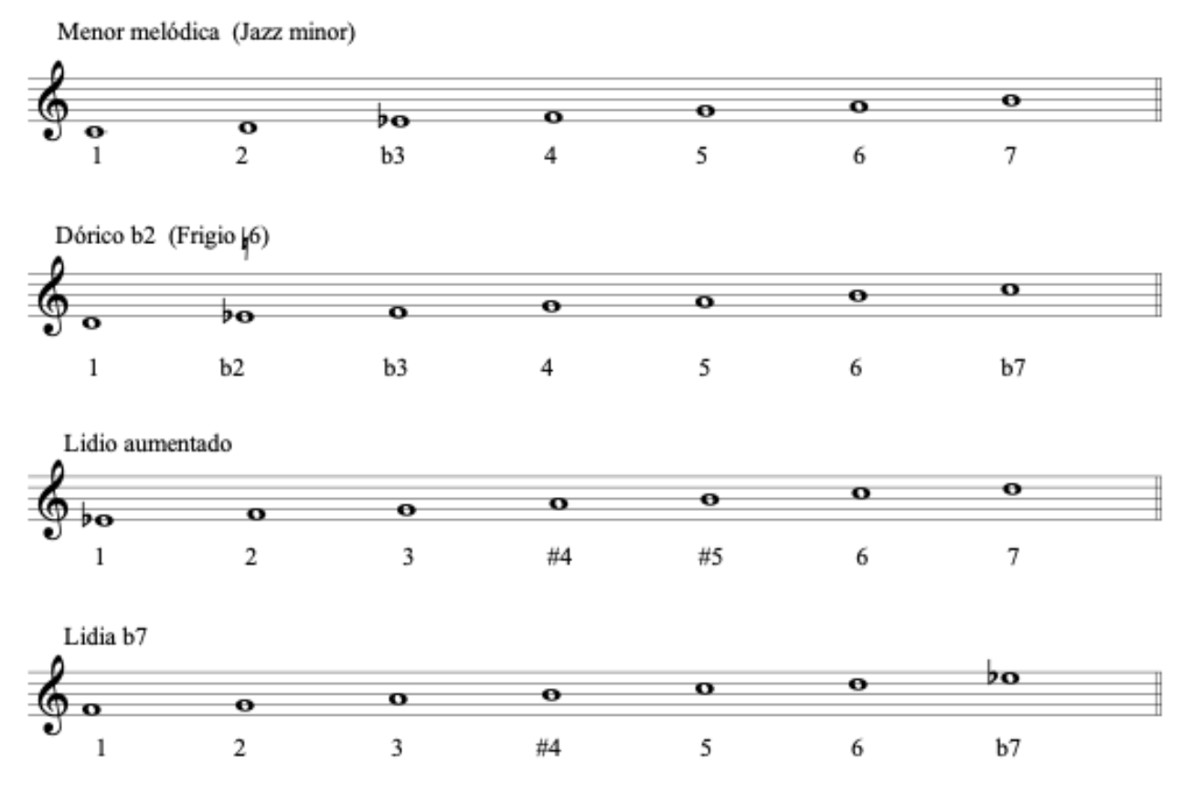 MODOS DE LA ESCALA MELÓDICA: Cada uno de los MODOS que se generan a partir de las distintas notas de la ESCALA MENOR MELÓDICA, tomando cada vez una de ellas como TÓNICA.