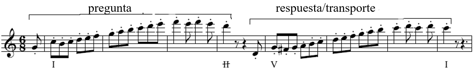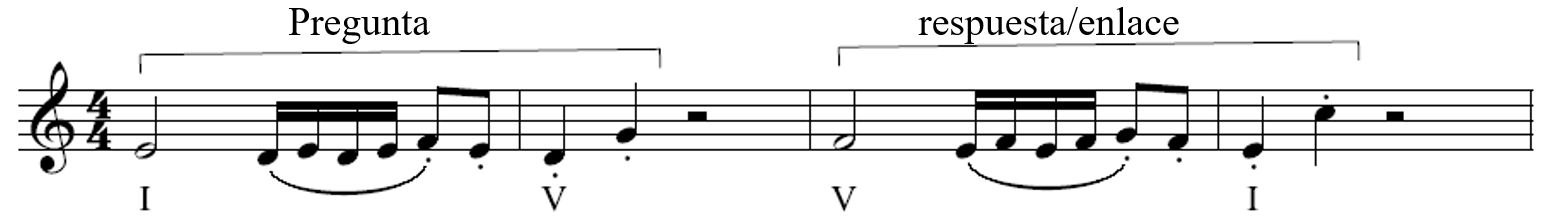 1. Como TÉCNICA DE DESARROLLO MOTÍVICO, el elemento determinante para la sensación de pregunta-respuesta es el armónico, por lo que definiremos como PREGUNTA un MOTIVO o SEMIFRASE que termina en un ACORDE distinto de I y como RESPUESTA su ADAPTACIÓN (por ENLACE ARMÓNICO, TRANSPORTEo CAMBIO DE NIVEL) terminando en I, o al menos en una ARMONÍA más conclusiva que la de la pregunta. La pregunta más sencilla es I-V y su respuesta V-I, pero existen muchas más posibilidades.