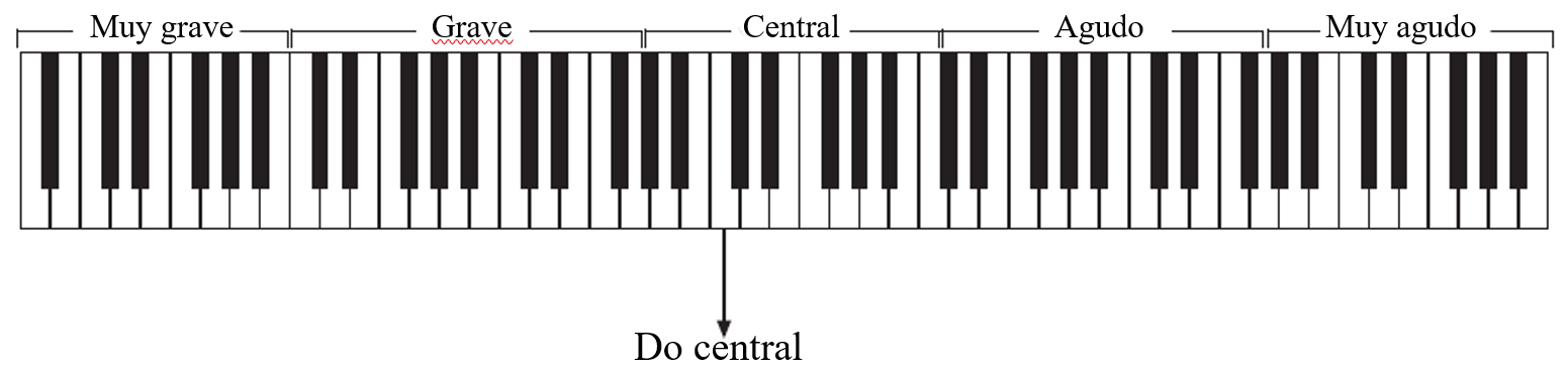 El piano puede ser el instrumento de referencia para hablar de los registros por su amplitud y su difusión. Los registros serán llamados: muy grave, grave, central, agudo y muy agudo, abarcando cada uno alrededor de una octava y media. Las fronteras entre los registros no son absolutas y pueden solaparse hasta cierto punto.